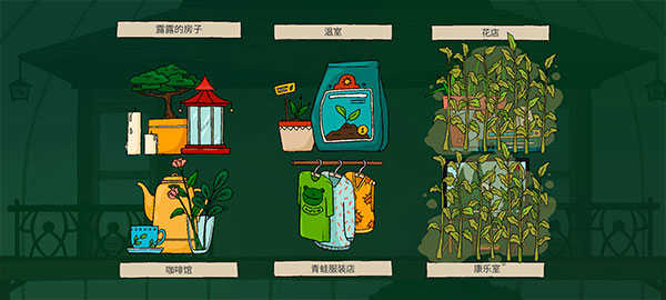 游戲里設有不少房間,像咖啡館、花店、溫室、青蛙露露的住所和娛樂室之類,還有幾種風格各異的獨特內飾能挑選,讓你可以盡情實現自己的各種心情與想法!
