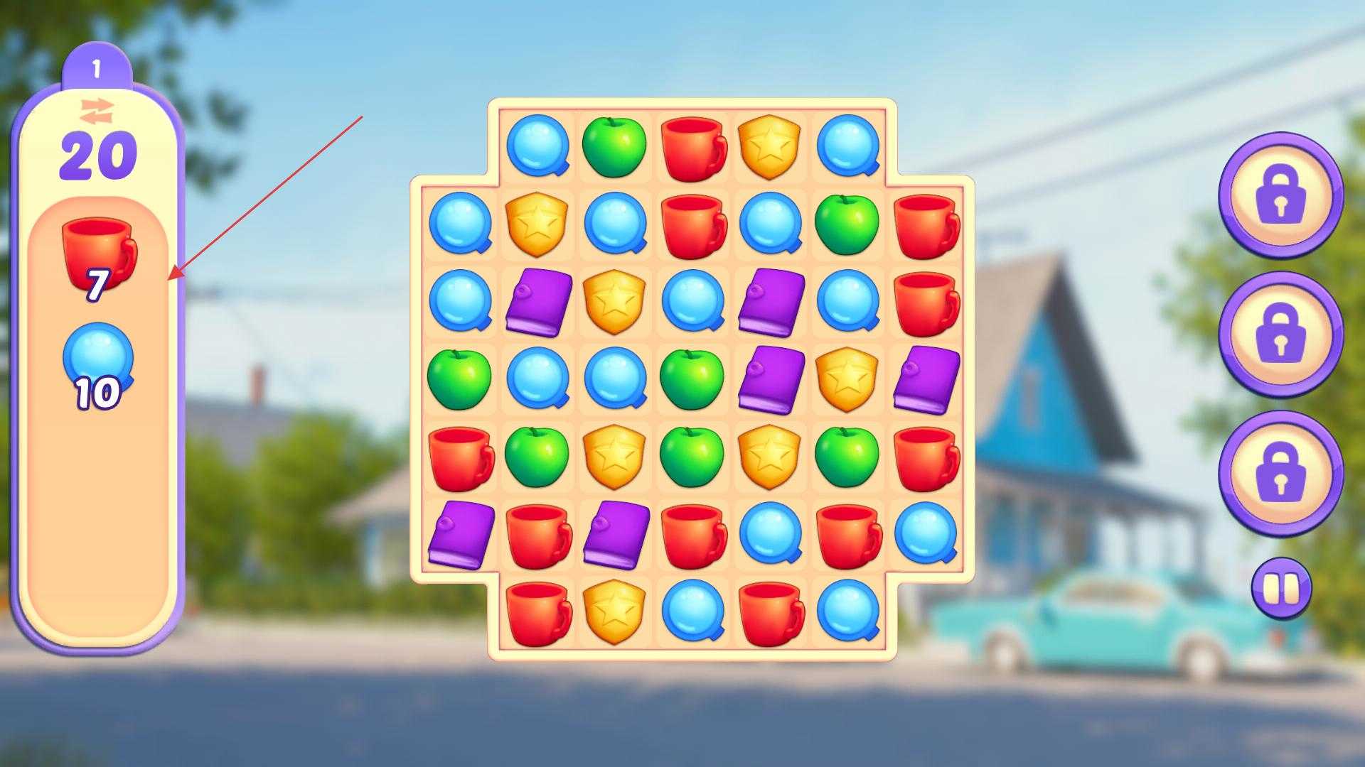 按照提示,當有三個相同物品連在一起時就能收集它們。仔細看看棋盤,先把注意力放在紅色杯子、藍色圓球這類指定物品上,試著把相鄰的物品挪動一下,讓三個一樣的湊到一塊兒來完成收集。