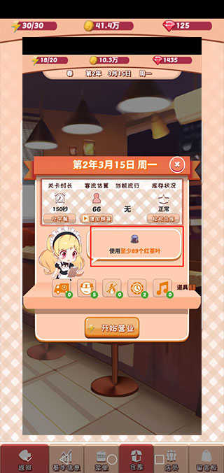 有時候碰到營業任務要求用多少份紅茶、烏龍茶這類原料,要是覺得有點難完成又不想看廣告,其實可以去廚房把原料換出來,再換回自己原本的菜單,這樣任務就會刷新了——畢竟這類任務是隨機生成的嘛。