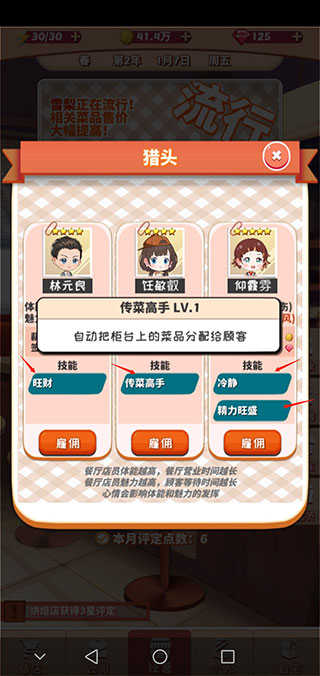 下面簡單說幾個比較通用的技能:傳菜高手(做好的菜放在吧臺后會自動分配給顧客)、旺財(能提高每日營業的收入)、推銷(顧客有一定概率點最貴的菜品)。這三個是我個人認為最好用的。