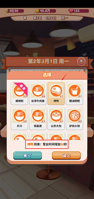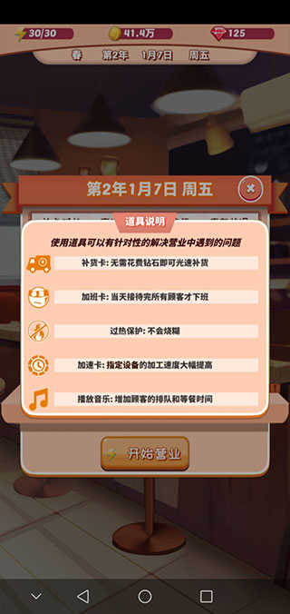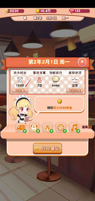 增加營業時間除了需要體力好的員工,還能借助道具實現。比如吃早餐就能延長營業的秒數,另外還有“必勝”機制,得接待完所有顧客才能結束營業。
