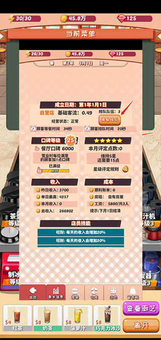 提升餐廳的星級等級,星級越高,對應的價格也會相應提高(星級范圍為1到5,而造詣等級是1到6,且造詣默認初始就有1星)