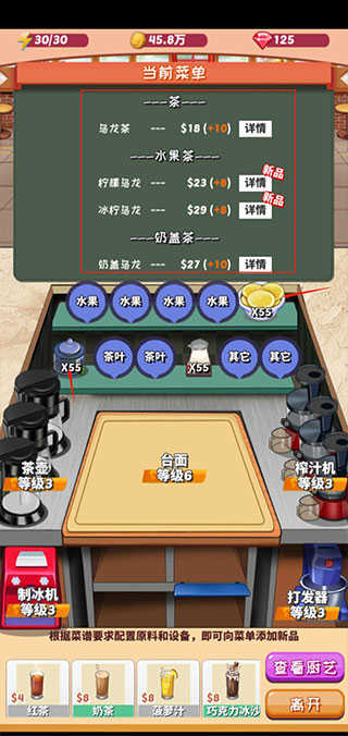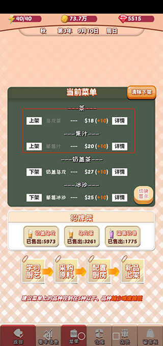 比如學了冰檸烏龍這道飲品,就得先去商店把烏龍茶葉和檸檬買好,還得把制冰機打開才行哦。等你把這些原料都上架之后,系統上面也會顯示出你當前能做的菜單呢。