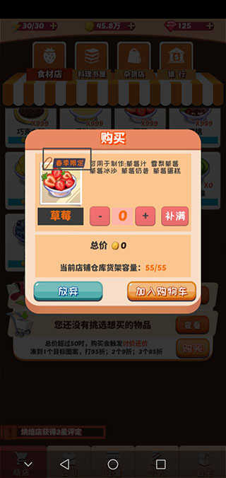 另外,商店里的食材列表支持上下滑動瀏覽。通常情況下,當季水果會被陳列在最下方;若想購買反季水果,點擊時系統會提示該水果的上架季節;而當季水果則會標注“當季限定”的字樣。