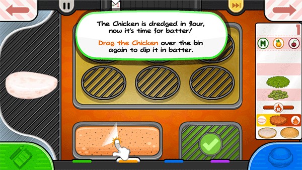 【面包、面糊與油炸】用各式各樣的面包屑和面糊給雞肉裹上外衣,再把雞肉放進油炸鍋烹炸到恰到好處!Papa Louie 想要在競爭里占據上風,所以說不定過些時候,他就會開始推出雞肉之外的其他可油炸食物啦!