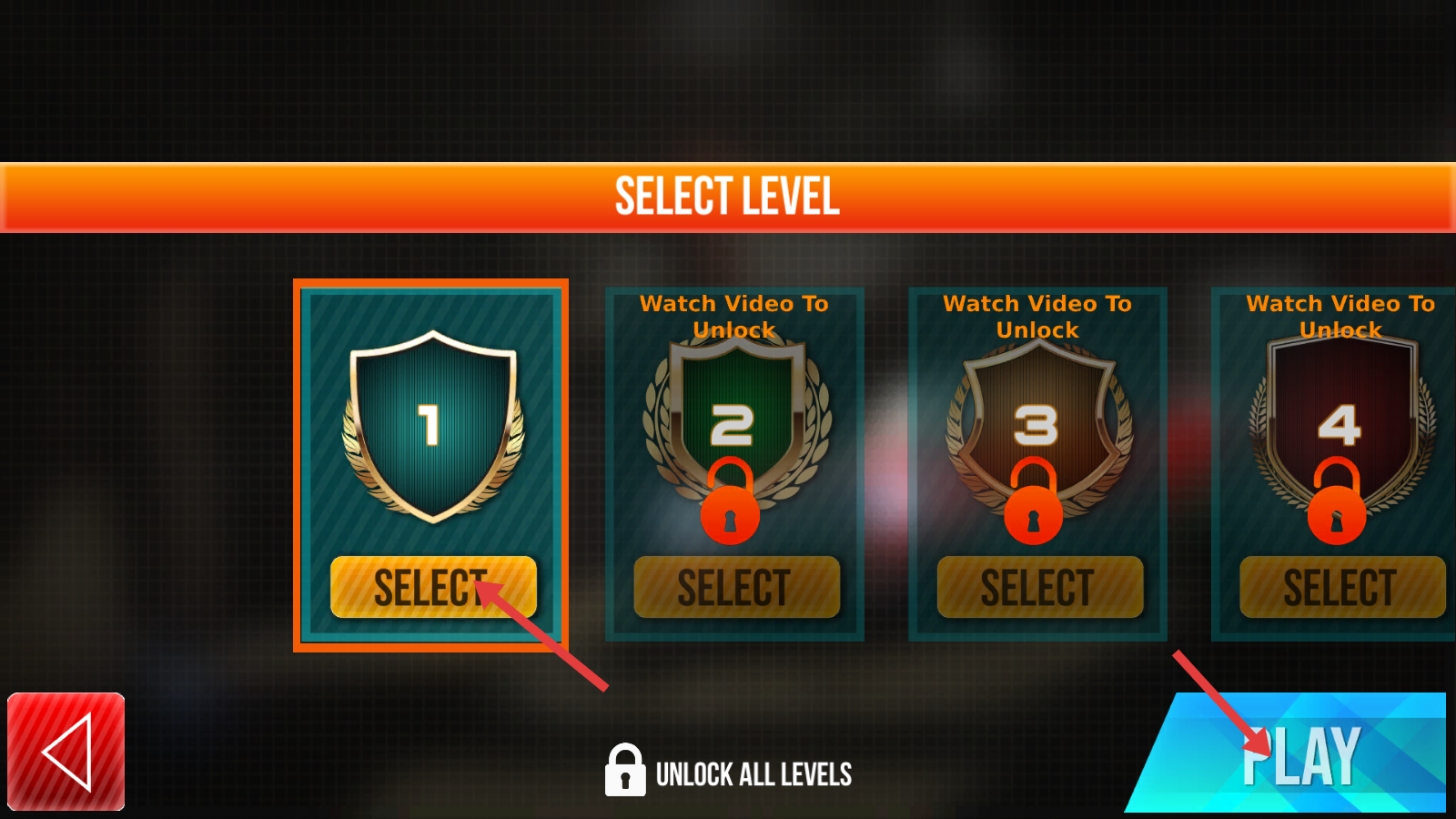 在【SELECT-LEVEL】界面點擊【SELECT】按鈕選擇【等級1】,接著點擊【PLAY】按鈕,即可開啟消防救援游戲的挑戰。