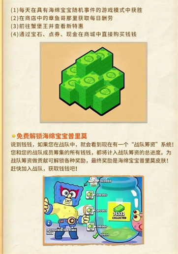 在海綿寶寶主題活動里,會推出專屬的活動貨幣,它的名稱是【錢錢】。玩家可以用【錢錢】直接兌換強化道具與聯動皮膚,具體的獲取途徑如下: