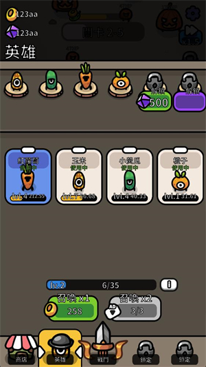 點(diǎn)擊下方的英雄按鈕能夠召喚出各式各樣的水果,召喚完成后,你既可以選擇讓它們上陣作戰(zhàn),也可以用它們來(lái)強(qiáng)化其他水果。