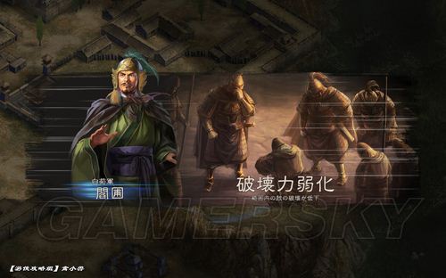 我方兩路弓箭手,一路槍兵登城守門,閻圃無限使用破壞力弱化,拖延敵軍拆門的速度。