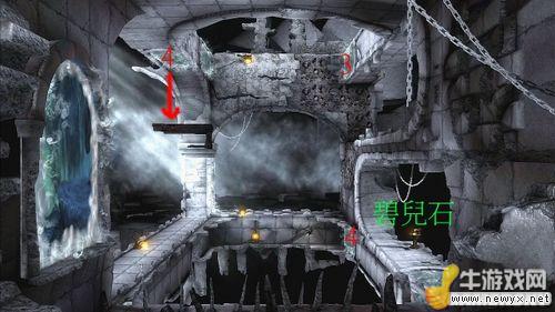 再往門回走,來到上層,走到石塊上跳到對面邊,往右邊的門進(jìn)入,算準(zhǔn)時間差落在空中一直移動的桌子,利用桌子的移動跳到右下角有碧兒翠絲石可以拿,非常重要。
