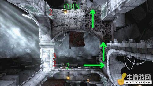 一但被桌子帶到左下角的傳送門后,就回不去了,一路直走,記錄后要接著到第四層去,第二條繩索上有COIN及圣物Octavian's Gold-屋大維的財富,到圖的位置,先用RB拉住障礙物,再按B鈕長推物體,緊接著跳上繩索擺蕩。