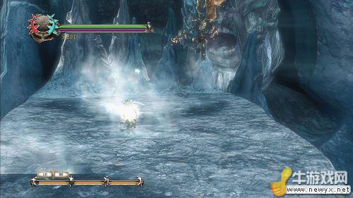 與維吉爾對話完也記錄好后就從繩索往下,來到圖的位置,這邊要注意的是后方冰巨人會吹風,此時如果腳步不注意就會被吹下斷崖,還有也要注意翼騎士的俯沖攻擊,因為在這小小塊的平臺上,被沖撞到通常都是掉到斷崖下,