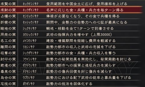 求賢 700 求財 450 占糧 300 折衝 450 縮地 600 用眾 800 名工 500 離間 750 收奪 400 封印 450