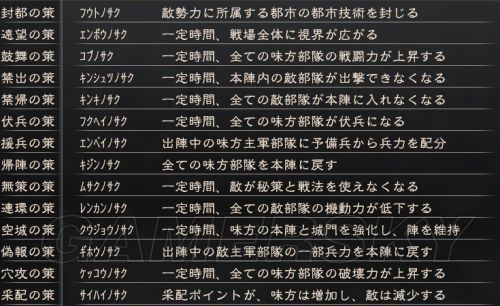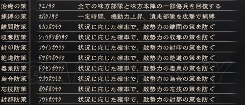 援兵 220 歸陣 220 無策 280 連環 280 空城 280 偽報 250 穴攻 250 采配 300 治愈 280 捕擄 280