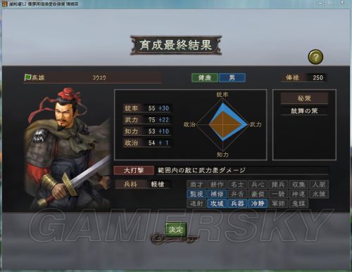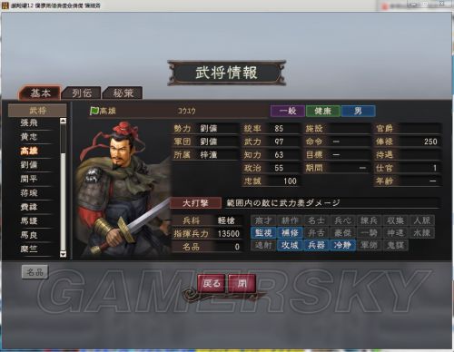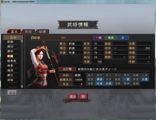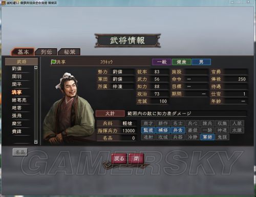 初始值:統率 55 武力 75 知力 53 政治 54