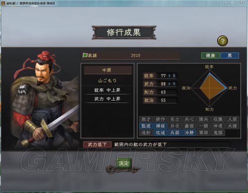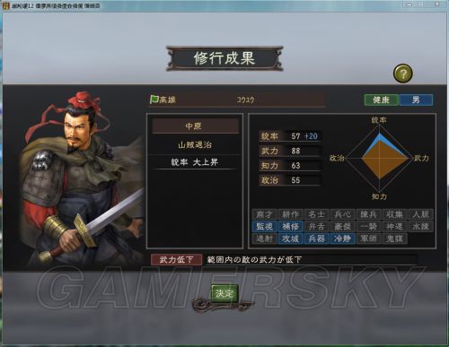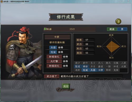 所以第一階段練完后屬性統率 57 武力 88 知力 63 政治 55(統加了2點武力加了13點,知政無視)