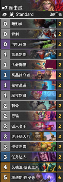 連擊賊依舊可用,且有著較為不錯的勝率表現。卡組中氮素制劑和艾德溫·范克里夫的投入經過對局的驗證可以說是合理的選擇:失去前期的天胡可能,但范克里夫在中期的回合依舊可以絕大多數情況作為巨型隨從打出,通過巨額場攻威脅對手;而氮素制劑的優(yōu)秀程度便是即便離開了高耐久武器自礪之鋒也是十分出色的水平。