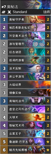 奧秘法最近的表現有所好轉,這個卡組的對局表現太極端了,適合用來對付場面薄弱依賴法術運作的卡組,恰好現在兩種常見的OTK卡組都撞在奧秘法的槍口上。