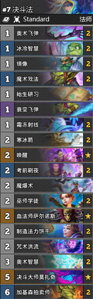 決斗法的表現(xiàn)有所好轉(zhuǎn),這是得益于這個(gè)卡組對(duì)跳費(fèi)騎、以及抓跳費(fèi)騎的吸血瞎有明顯優(yōu)勢(shì)的緣故。現(xiàn)在的構(gòu)筑分歧是,采用魔爆術(shù)控場(chǎng)還是采用冰環(huán)控場(chǎng)。由于現(xiàn)在主要的快攻卡組是德魯伊和盜賊,法強(qiáng)魔爆這個(gè)組合有相當(dāng)大的吸引力,而且魔爆對(duì)比冰環(huán)更不容易卡住加基森的刷牌。