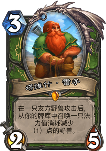 效果:在一只友方野獸攻擊后,從你的牌庫中召喚一只法力值消耗減少1點的野獸