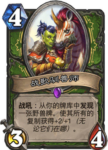 效果:從你的牌庫中發(fā)現(xiàn)一張野獸牌。使其所有的復(fù)制獲得+2/+1(無論它們在哪里)