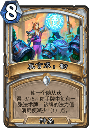 效果:使一個隨從獲得+3/+5.你手牌中每有一張法術牌,該牌的法力值消耗便減少1點