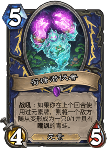 效果:戰吼——如果你在上個回合使用過元素牌,則將一個敵方隨從變形成為一只0/1并具有嘲諷的青蛙