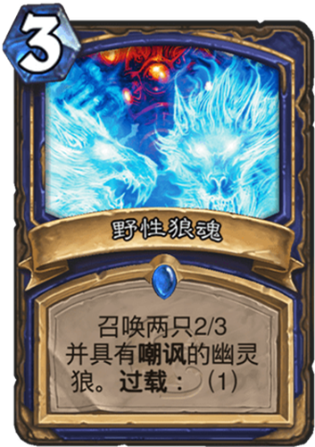效果:召喚兩只2/3并具有嘲諷的幽靈狼。過載——1