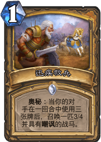 效果:奧秘——當你的對手在一回合中使用三張牌后,召喚一匹3/4并具有嘲諷的戰馬