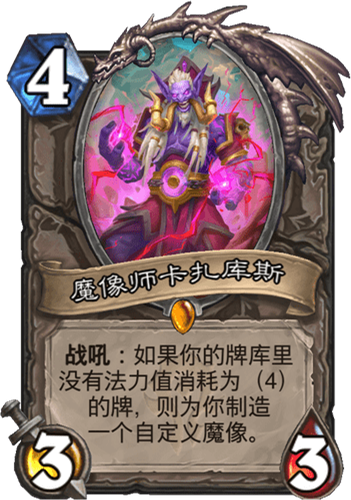 效果:戰(zhàn)吼——如果你的牌庫(kù)里沒(méi)有法力值消耗為4的牌,則為你制造一個(gè)自定義魔像