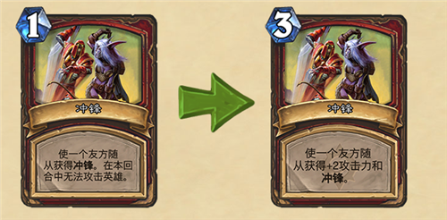 舊:[消耗1點法力值]使一個友方隨從獲得沖鋒。在本回合中無法攻擊英雄?!?新:[消耗3點法力值]使一個友方隨從獲得+2攻擊力和沖鋒。