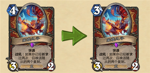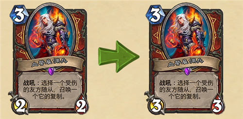 舊:2點攻擊力,2點生命值。→ 新:3點攻擊力,3點生命值。