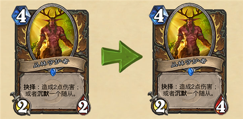 舊:2點(diǎn)攻擊力,2點(diǎn)生命值。→ 新:2點(diǎn)攻擊力,4點(diǎn)生命值。