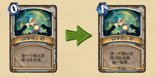 舊:[消耗0點法力值]使一個隨從獲得+2生命值。→ 新:[消耗1點法力值]使一個隨從獲得+2生命值。抽一張牌。