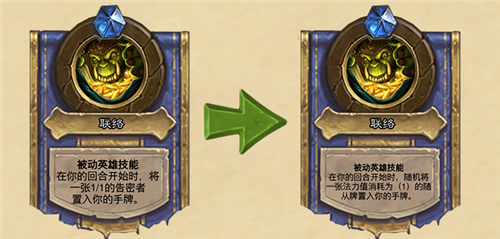 舊:在你的回合開始時,將一張1/1的告密者置入你的手牌。→ 新:在你的回合開始時,隨機將一張法力值消耗為(1)的隨從牌置入你的手牌。
