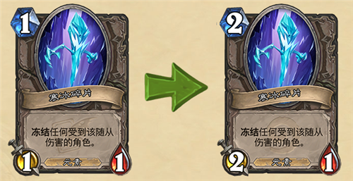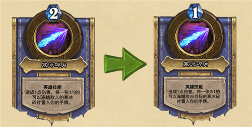 舊:[消耗2點法力值]造成1點傷害。將一張1/1的可以凍結敵人的寒冰碎片置入你的手牌。→ 新:[消耗1點法力值]造成1點傷害。將一張2/1的可以凍結敵人的寒冰碎片置入你的手牌。