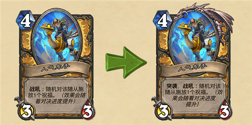 舊:戰吼:隨機對該隨從施放1個祝福。(效果會隨著對決進度提升) → 新:突襲。戰吼:隨機對該隨從施放1個祝福。(效果會隨著對決進度提升)