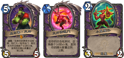效果:戰(zhàn)吼——如果你的牌庫中沒有牌,則打開一座傳送門,每回合為你召喚數(shù)個3/2的小鬼,直到你的隨從數(shù)量達(dá)到上限