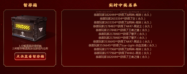 3、抽獎:消耗鑰匙進行單抽和十連抽,抽獎獲得的可分解道具存放在【暫存箱】中,可選擇分解成鑰匙或發往游戲倉庫,已經領取到倉庫的道具無法退換,請慎重(在參與活動期間請確認好綁定的大區);唯一性道具(如:超級護目鏡)等,可重復抽到,但在同一大區內,游戲倉庫無法重復到賬;