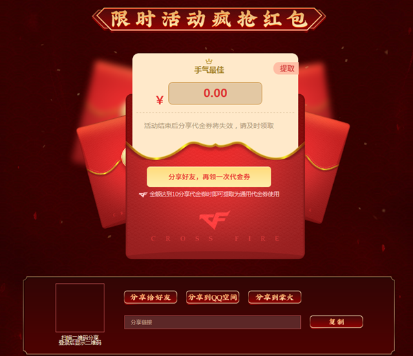 12、可通過分享頁面鏈接,讓其他玩家點擊分享頁面彈窗中的打開按鈕,即可為自己增加分享代金券金額,金額達到10分享代金券金額時即可提取1次,單q最多可提取2次;