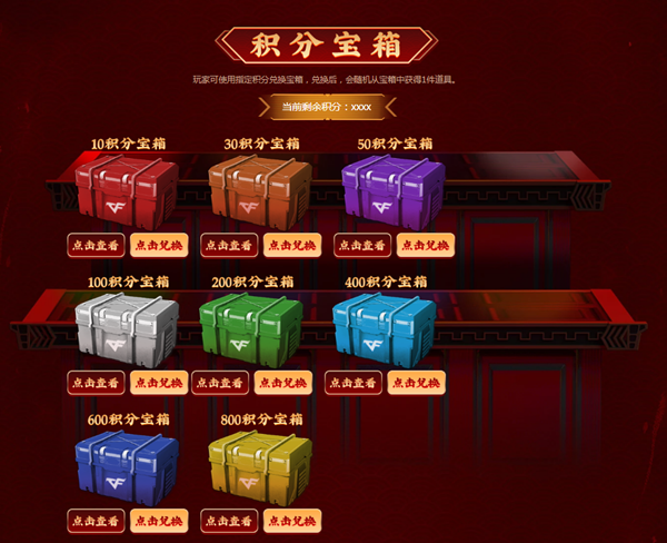 5、個人積分寶箱兌換規則:玩家可使用指定積分兌換寶箱,兌換后,會隨機從寶箱中獲得1件道具。