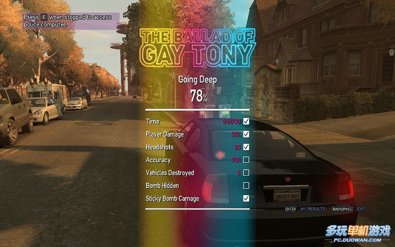 這個(gè)任務(wù)要求比較多第一,完成時(shí)間要在6分30秒。第二受傷值要自愛(ài)50%一下,第三要有20個(gè)爆頭,第四命中率要在70%,第五要摧毀至少5個(gè)警車(chē);第六,炸彈放置要不被發(fā)現(xiàn)第七,炸彈引爆之后要炸死一大批人,第六和第七都比較簡(jiǎn)單,只要安置好炸彈 不要過(guò)早引爆就可以了