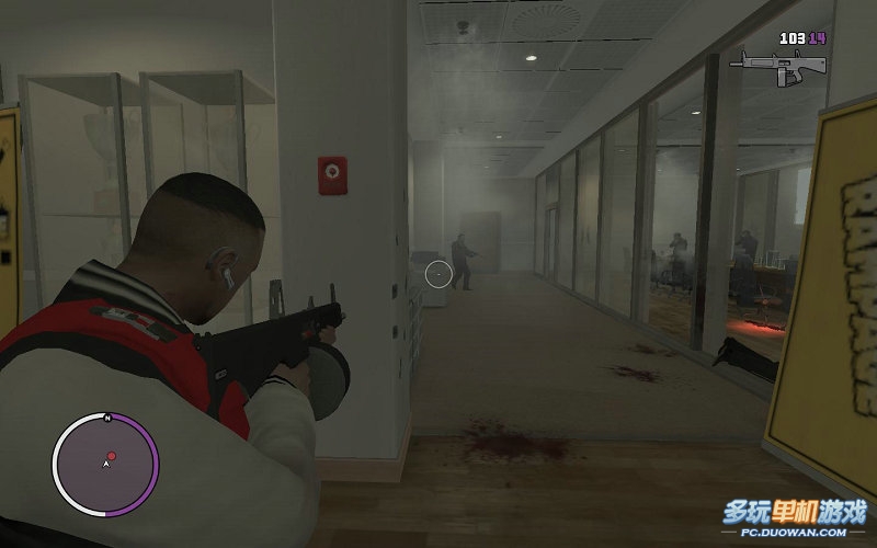 一路沖殺到最后的地方;在這里可以扔幾顆手雷吧辦公室里面的人干掉