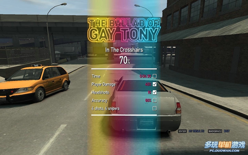 一路沖下,搶輛車(chē)子擺脫通緝即可完成任務(wù)本任務(wù)有如下要求第一完成時(shí)間在4分30秒內(nèi);第二是玩家的受傷值在40%之內(nèi);第三是必須有10個(gè)爆頭,第四是60%的命中率;第五則是在開(kāi)始的時(shí)候4槍解決4個(gè)狙擊手