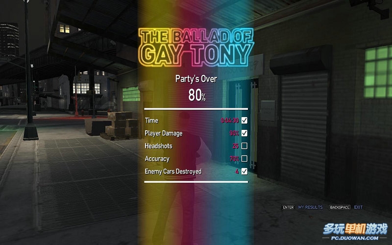 這個(gè)關(guān)也是很簡(jiǎn)單的。首先完成時(shí)間要在4分30秒,其次玩家傷害值要在90%以?xún)?nèi);在次要有25個(gè)爆頭和70%的命中率。最后則是打爆4輛車(chē)子