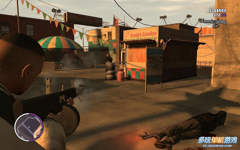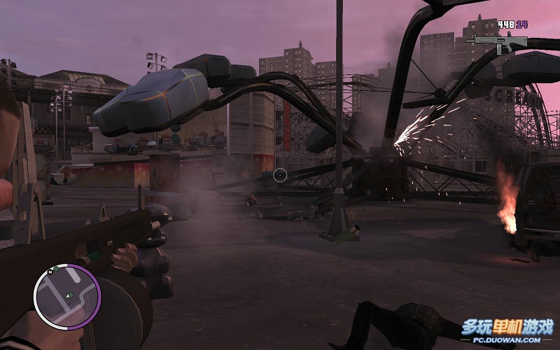 進(jìn)入游樂(lè)場(chǎng);這里的敵人很多都藏在建筑物后面;你可以利用中間的旋轉(zhuǎn)車(chē)當(dāng)做躲避敵人子彈的遮擋物