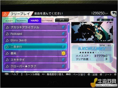 難度方面,依舊分為四個等級,整體難度比前作要高。Easy難度只有一個按鍵和一種觸摸音符,適合新手練習。Normal難度增加為4鍵和3種觸摸音符,難度增加了不少,音符總數量整體也比前作多,有些歌竟然會感到手酸。Hard難度為8鍵和3種觸摸音符,但是音符總量與Normal模式相比沒有太大增加,所以難度沒有太大跳躍。最后Extreme模式依舊是大家熟悉的毀按鍵模式,本作有些物品需要通過extreme模式解鎖,想要刷白金的玩家們請努力。另外值得一提的是觸摸音符的判定比前作略為嚴格,因此像歌姬計劃F的時候那樣亂劃是很容易漏掉的。