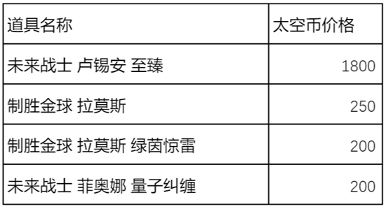 同時,太空秘寶活動將于4月20日12:00更新太空幣兌換獎池,以下道具將加入獎池兌換:
