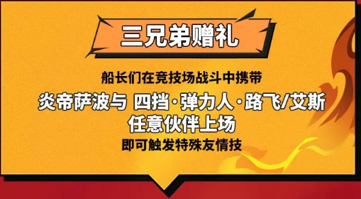 在競技場對戰中,攜帶“炎帝薩博與四檔彈力人路飛/艾斯”任意伙伴上陣,即可觸發特殊友情技,體驗角色間的羈絆特效。