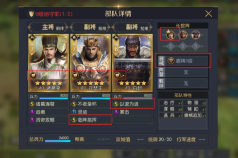 8級(jí)地部隊(duì)數(shù)量提高到了24000*2,相比于7級(jí)地提高了整整6000的兵力,雖然都為全五星陣容,但8級(jí)地守軍的將領(lǐng)屬性、技能都強(qiáng)于7級(jí)地,且將領(lǐng)等級(jí)提高到了40級(jí),而且技能等級(jí)也都來到了7+5+3這個(gè)水平,器械也得到升級(jí)。最主要的提升在于守軍的搭配更合理,基本都為輸出+前排或輸出+治療的配置。